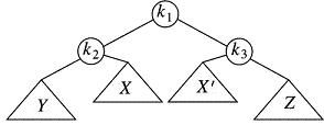 As you can see, the subtrees X and X' are not necessarily taller than Y and Z, because we have now separated out the root, k1, which accounts for the extra height. If X (or X'), Y and Z are all, say height 9, then the diagram shows that we still have a bad AVL condition at k3 because k3's right subtree, Z, has height 9 but its left subtree, rooted at k2 has height 11 on account of either X or X' (we don't know or care which) having height 9 and nodes k1 and k2 adding 2 more, causing k2 to have height 11.. The big picture here is that the problem of extra height which forms an imbalance at k3 comes about by starting at k3 and jogging left, then right, not left then left.