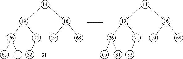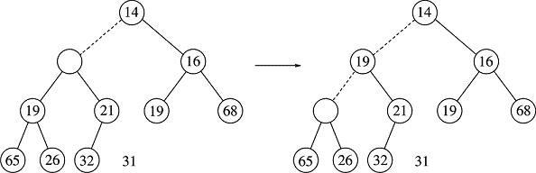 In the following picture, we remove 13 from the binary heap. This leaves an unused node at the root, which we fill with the last item (31) in the tree (conceptually, not literally). This is the prep before calling percolateDown():