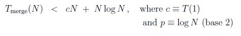 From this observation, and the fact that the above function is recursive, we can form a recursive relation (like we did in week 3 ... so long ago). If T(N) is the time our mergeSort takes to process arraySize = N elements, we have T(N) = 2T(N/2) + N. Imagine that N is a power of 2, say N = 2p, for some integer p (for example N = 256 means p = 8). Then, after p function calls we will be at the end case where the recursion will stop and start to unwind. Let's apply the relation