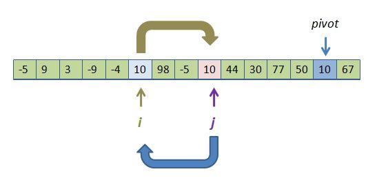 This seems innocuous. Imagine, though, that you have 1 million objects and 2% are the same, say 10. The plan just described would put them all on the left, causing that sub-array to have a bunch of 10s -- 20,000 of them -- clumped together in the left-sub array and passed to recursive quickSort call. (This scenario doesn't sound likely, but remember, we are only sorting on one field. If we were sorting on star "types", say, while there are billions of stars, there are only about 20 different types. These would very quickly form gigantic clumps of contiguous "equal" objects.) So, the strategy of letting i pass over pivots while j stops at them causes an immediate clumping of pivot values for the next generation of recursion. It leads, at lower levels of recursion to arrays that look like this: